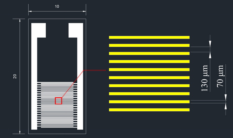 1、基材:氧化鋁陶瓷;外形尺寸:20mm*10mm。2、指寬:7oum,指間距:130um,指長:6.3mm。叉指對數(shù): 20對(40指)。