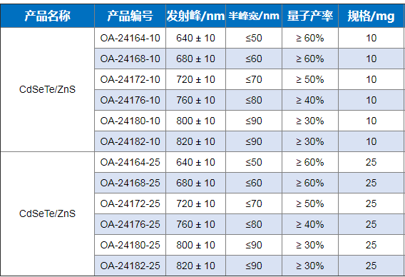 油溶性CdSeTe/ZnS量子點產品是以CdSeTe為核心,ZnS為殼層,表面由疏水配體包裹的核/殼型熒光納米材料,平均的量子產率為50%,儲存時應避免陽光直射,4度密封暗處保存,可以為客戶訂制生產640nm~820nm任一波長不同克數的產品。本產品具有粒徑均一,吸收光譜寬泛,發射光譜對稱,熒光強度高而穩定等特點,可應用于太陽能電池、發光器件與生物熒光標記等領域