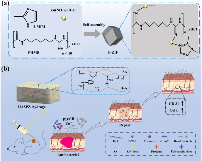 其他說明:密封狀態(tài)下保質(zhì)期半年【主要優(yōu)勢】通過將聚六亞甲基雙胍(PHMB)負(fù)載到 ZIF-8 納米粒子的框架中來獲得 pH 響應(yīng)性抗菌 P-ZIF(ZIF:沸石咪唑酯框架)。這將使 PHMB 能夠在受感染傷口的弱酸環(huán)境中釋放。為了解決燒傷感染問題,將 P-ZIF 納米粒子通過硼酸酯鍵加載到由海藻酸鈉 (SA) 和 3-氨基苯硼酸修飾的類人膠原蛋白 (H-A) 制成的水凝膠系統(tǒng)中