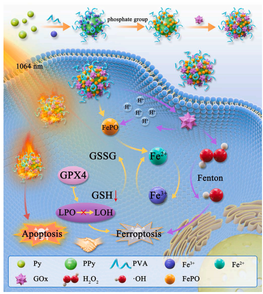 Polypyrrole-iron phosphate-glucose oxidase-based nanocomposite with cascade catalytic capacity for tumor synergistic apoptosis-ferroptosis therapy