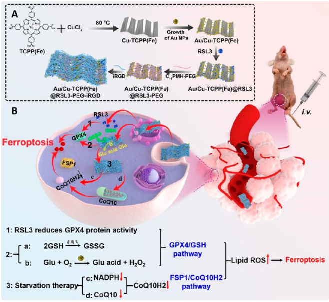 Composition: Au, Cu-TCPP (Fe), RSL 3, PEG, and iRGD