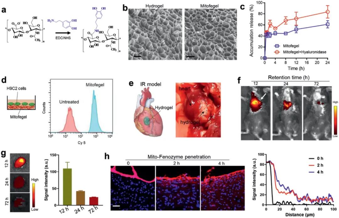 (2)在心臟缺血-再灌注動(dòng)物模型中,實(shí)驗(yàn)分別通過全身遞送和局部釋放黏附水凝膠(即心臟貼片)的方式證明了該雜交納米酶可在體內(nèi)對(duì)線粒體氧化損傷和在梗死后心臟功能的恢復(fù)過程中發(fā)揮保護(hù)作用。綜上所述,這一研究充分闡明了模擬酶的從頭設(shè)計(jì)策略,同時(shí)也為緩解氧化損傷提供了一個(gè)新型的治療選擇。