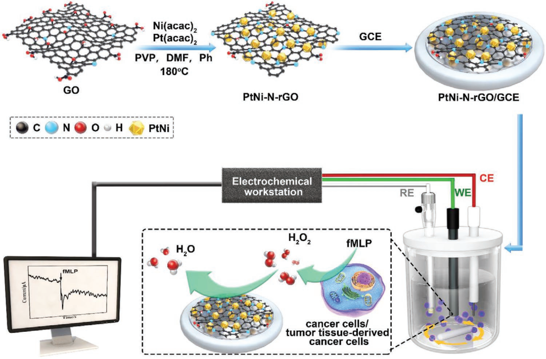 惡性腫瘤的診斷對于臨床的治療選擇決定而言是至關重要的。目前的影像學和病理診斷方法往往不能提供在腫瘤中重要的定量分子信息。腫瘤微環境中已被證明含有過氧化氫(H2O2)。有鑒于此,四川大學錢志勇教授提出了一種基于PtNi納米顆粒和摻氮的還原氧化石墨烯(PtNi-N-GO)的生物敏感、高效的H2O2電化學傳感器,其具有低檢測限(2.8×10–9 M)、快速的響應時間(<6 s)和良好的抗干擾性能。
