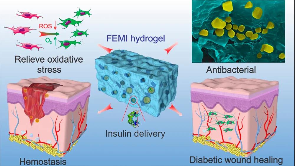 為了應對糖尿病傷口的細菌感染、高氧化及高血糖問題,來自西北工業大學的張秋禹教授團隊開發出一種基于醛基化改性F127膠束/聚賴氨酸包被二氧化錳的可注射水凝膠(FEM水凝膠)。該水凝膠體系中聚賴氨酸具有抗菌性,二氧化錳的還原性用于中和氧化性物質,F127可以包載胰島素用于降低血糖。相關研究論文:Nanoenzyme-Reinforced Injectable Hydrogel for Healing Diabetic Wounds Infected with Multidrug Resistant Bacteria發表于雜志Nano Letters上。