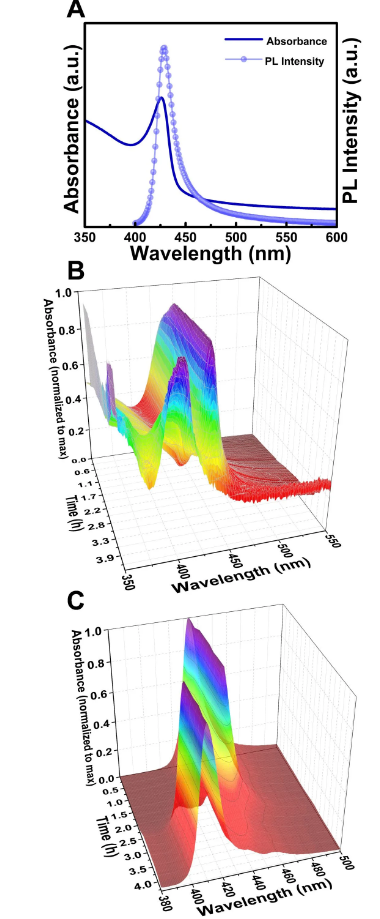 此外,他們的研究還發(fā)現(xiàn),在一定的實(shí)驗(yàn)條件下,通過(guò)使用合適的配體,反應(yīng)可以產(chǎn)生比PMSCs尺寸更小和更難吸收的粒子,即使在沒(méi)有A(甲基胺-MA+)組分參與的條件下也會(huì)產(chǎn)生。
