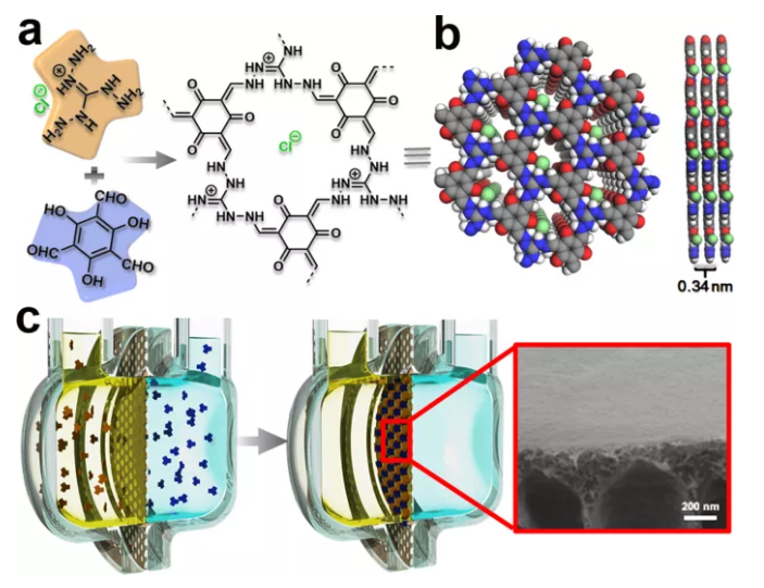 圖1作為仿生溫度計的離子共價有機框架納米流控膜高離子密度有利于產生單極離子環境,而德拜屏蔽長度是取決于溶液離子強度的特征長度(離子強度越高,德拜長度越小)。因此,COF孔徑越小、荷電密度越高,選擇性更好。為了模仿thermo-TRP離子通道,選用1,3,5-三甲酰基間苯三酚(Tp)與鹽酸三氨基胍(Tag)縮合成的COF作為納米流控系統(Fig.2a,b)。