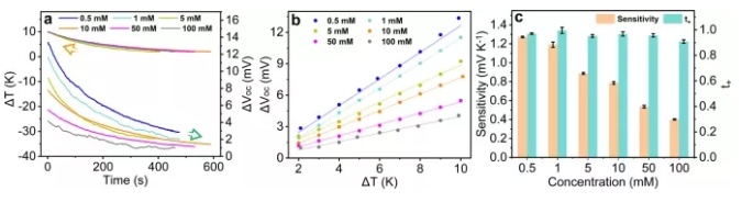圖4 Tp Tag-COF/PAN在不同濃度的KCl水溶液(0.5~100 mM)中的熱響應性能。【制備可穿戴溫度傳感器】基于這些結果,作者探索了Tp Tag-COF/PAN在設計具有熱感覺能力的可穿戴設備中的潛力。作為一個傳感器,膜被放置在浸入KCl溶液(1 mM)的碳布之間。通過簡單加熱或冷卻一塊碳布來誘導溫度梯度,并使用上述方法進行測量。由此產生的電位變化由Ag/AgCl電極檢測。當系統恢復熱平衡后,施加另一個溫度梯度來檢測動態電位變化。圖5顯示了熱感覺系統的實時輸出電位響應,證明了其靈敏度和重復性。此外,輸出電位響應不同溫度梯度的變化幅度也有明顯差異?偟膩碚f,所開發的熱感覺系統在可穿戴溫度傳感器的設計上顯示出巨大的應用潛力。