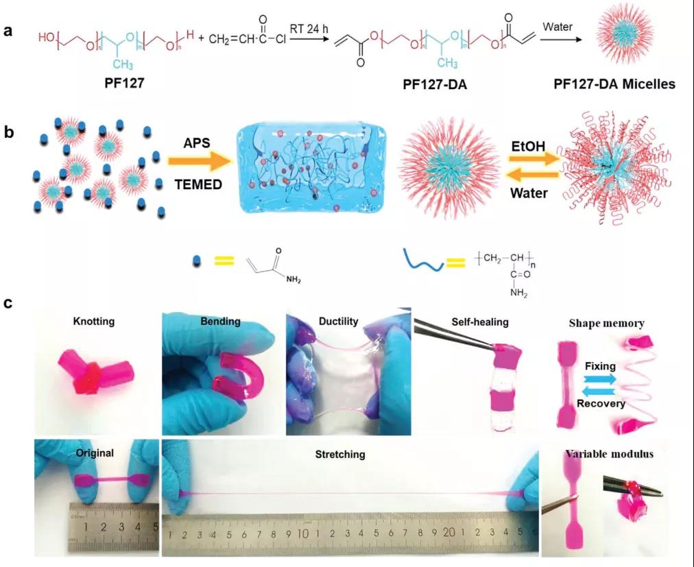 圖1 PAM/PF127水凝膠的合成原理圖及性能表征。(a) PF127-DA的合成;(b) PAM/PF127水凝膠的合成及其在水或乙醇中的微結構;(c)固含量為10 wt%的PAM/PF127水凝膠的性能測試,包括打結、彎曲、延性、拉伸、形狀記憶、自愈合、可變模量等。文章亮點:1、作者通過溶劑誘導的PF127-DA分子鏈的聚乙烯氧化物(PEO)片段的結晶和基體體積相變來實現可變模量和形狀記憶,這是一個可循環的純物理過程。2、作者采用PF127-DA膠束海島結構來優化力學性能,而不是通過引入犧牲鍵,體現了水凝膠材料的高韌性和低滯后性能。此外,PAM/PF127水凝膠對變形性、彈性、溶劑誘導的形狀記憶性和變模量特性均具有較高的靈敏度。3、作者對PAM/PF127水凝膠的微觀結構與性能進行了表征,證明了水凝膠的海島結構的存在,同時探討了在乙醇中結晶是由氫鍵離解引起的。