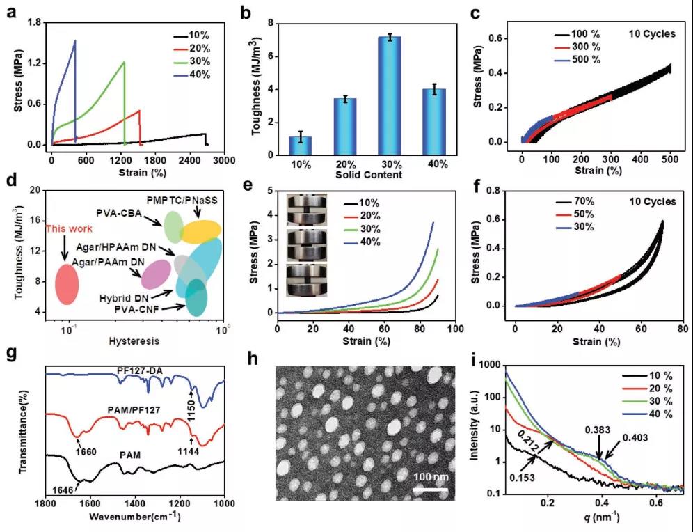 圖2 PAM/PF127水凝膠在水中的力學測試和結構分析。(a)在不同固含量下,PAM/PF127水凝膠的拉伸應力-應變曲線;(b)在不同固含量下,PAM/PF127水凝膠的韌性;(c)固含量為30 wt%的PAM/PF127水凝膠在不同應變下連續10次加載-卸載拉伸循環測試;d) 韌性-滯后圖;(e)不同固含量的PAM/PF127水凝膠的壓縮應力-應變曲線;(f)固體含量為30 wt%的PAM/PF127水凝膠在不同應變下連續10次加載-卸載壓縮循環測試;(g)聚丙烯酰胺、PF127- DA和30 wt%固含量的PAM/PF127水凝膠的FTIR光譜圖;(h)30 wt%固含量的PAM/PF127水凝膠的TEM圖像;(i)不同固含量的PAM/PF127水凝膠的SAXS曲線。