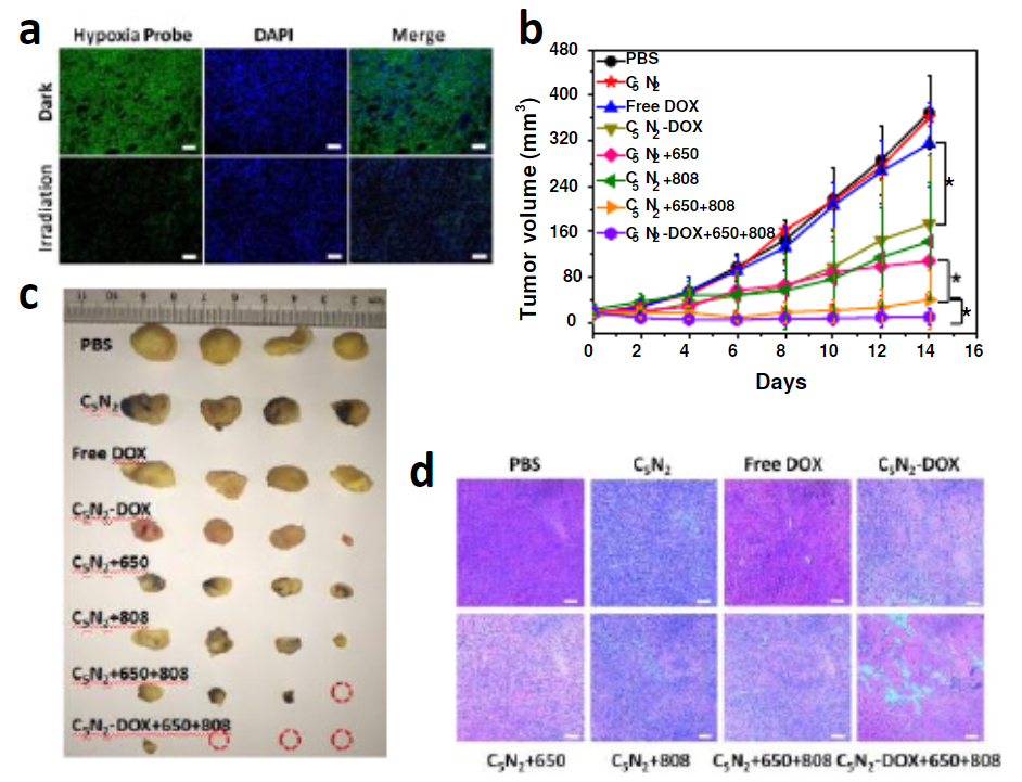 本文要點:(1)實驗通過一步法制備了克級C5N2納米顆粒(NPs)基有機半導(dǎo)體。在650 nm激光照射下,該半導(dǎo)體可裂解水以生成O2,并同時產(chǎn)生單態(tài)氧(1O2),表明在該有機半導(dǎo)體中可以同時作為生成O2的光催化劑和產(chǎn)生1O2的光敏劑(PS)。