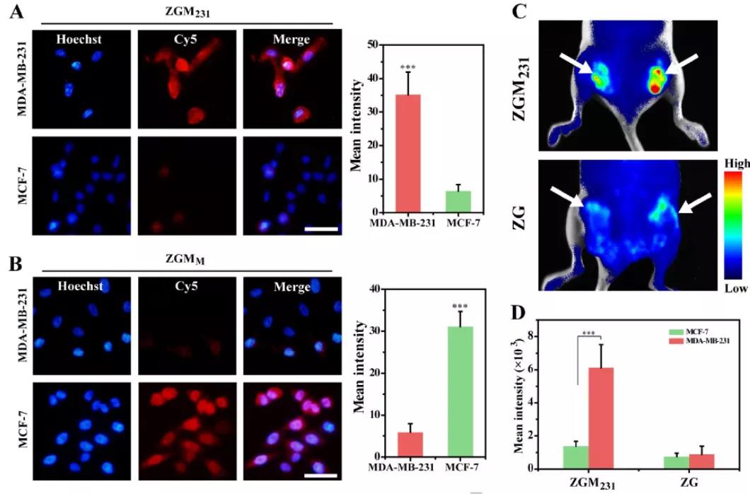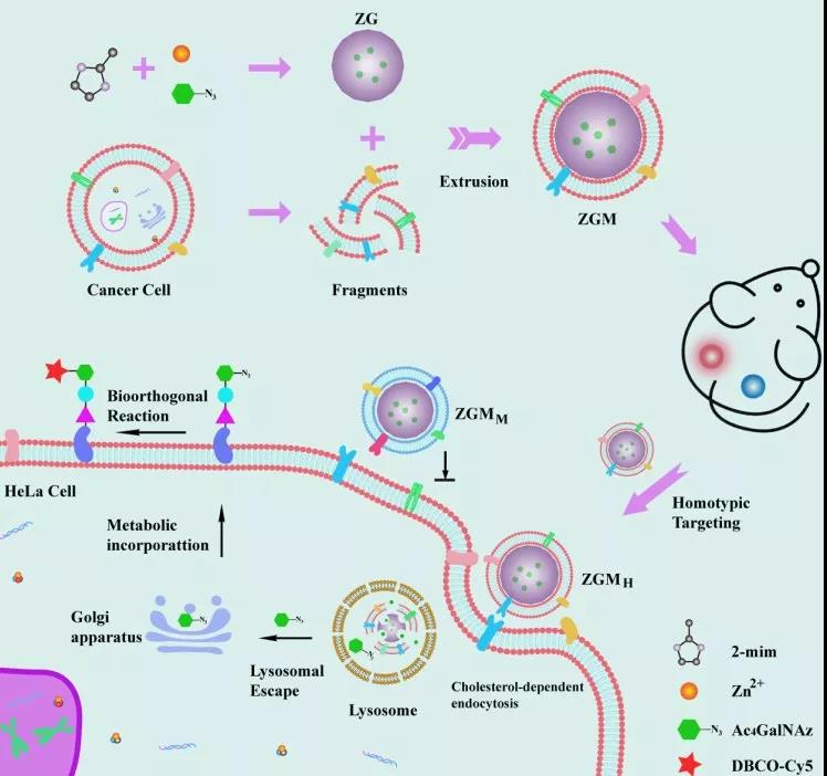本文要點(diǎn):(1)該仿生平臺(tái)具有豐富的受體,不僅可以選擇性地靶向同型細(xì)胞,還可以實(shí)現(xiàn)對(duì)不同乳腺癌亞型的選擇性MGL。此外,具有內(nèi)溶酶體逃逸性能的ZIF-8可使得疊氮糖從溶酶體中逃逸并加速其代謝整合。