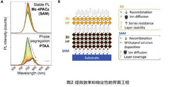 最小化復(fù)合和降解的界面工程是高效穩(wěn)定性能的關(guān)鍵除了理解和控制薄膜中的缺陷,將鹵化物鈣鈦礦太陽(yáng)能電池的效率提高到極限值還需要關(guān)注界面的設(shè)計(jì),以消除非輻射損失,實(shí)現(xiàn)有效的、選擇性的電荷提取。