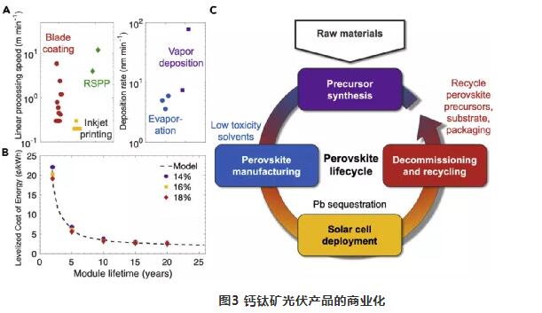 鈣鈦礦生產(chǎn)的速度,穩(wěn)定性和毒性因素量產(chǎn)速度盡管現(xiàn)已成功制造了效率>25%的單結(jié)鈣鈦礦太陽(yáng)能電池,但有效面積只有約0.1 cm2。要實(shí)現(xiàn)千兆瓦規(guī)模的鈣鈦礦生產(chǎn),每年將需要沉積數(shù)百萬(wàn)平方米的電池。這不僅需要開(kāi)發(fā)能夠在>100 cm2面積的模組上生長(zhǎng)均勻和高質(zhì)量薄膜的沉積方法,速度也是一個(gè)必要的考慮因素。處理速度會(huì)影響每個(gè)制造小時(shí)可處理的模組數(shù)量,而提高處理速度對(duì)于降低資本密集度,模組制造成本和度電成本(LCOE)至關(guān)重要。因此,大面積溶液處理方法(例如,刮刀涂布,噴墨印刷,狹縫涂布,絲網(wǎng)印刷和凹版印刷)因其與環(huán)境條件下高通量卷對(duì)卷的兼容性而備受關(guān)注。(圖3 A)