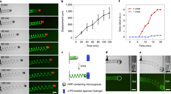 人工細(xì)胞樣群落參與多種化學(xué)相互作用模式,但與當(dāng)?shù)丨h(huán)境的接觸極少。最近,英國(guó)布里斯托大學(xué)Mei Li博士/Stephen Mann院士團(tuán)隊(duì)開(kāi)發(fā)了一種交互式微系統(tǒng),該系統(tǒng)基于將一群酶活性半透性蛋白體固定在螺旋水凝膠絲內(nèi),以實(shí)現(xiàn)信號(hào)誘導(dǎo)運(yùn)動(dòng)。