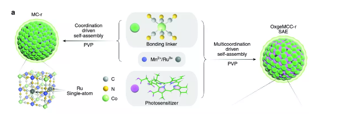 1、單原子納米酶用于光動力治療[1]光動力治療(PDT)是指光敏劑在接受一定波長的激光照射之后產生大量活性氧(ROS)來實現(xiàn)對癌細胞的氧化損傷,憑借其可控性強、副作用低等優(yōu)勢被廣泛應用到癌癥治療等領域。這種療法依賴于局部的O2分子來產生高細胞毒性的單態(tài)氧(1O2),但實體腫瘤缺氧微環(huán)境會影響光動力療法的治療效果。為了解決上述問題南洋理工大學趙彥利研究團隊設計了一種安全、高效的自組裝納米制劑,單原子納米酶(OxgeMCC-r)。研究者通過一步自組裝技術將具有類過氧化氫酶活性的釕原子固定在Mn3[Co(CN)6]2多孔材料中,同時將光敏劑Ce6包覆在MOFs材料中。該復合納米酶具有可控的尺寸和形貌,較高的負載能力。在腫瘤部位OxgeMCC-r納米酶催化內源性的過氧化氫產生氧氣,有效的緩解了腫瘤內部的乏氧環(huán)境,顯著性提高了光動力治療效果,體外和體內實驗都證明了OxgeMCC-r納米酶優(yōu)異的抗腫瘤效果,與此同時復合納米酶中的Mn2+可以用于T1磁共振成像能力。OxgeMCC-r SAE具有較高的Ce6負載能力、優(yōu)越的催化性能和體內跟蹤成像能力,將是一種很有前景的抗腫瘤藥物,促進不同單原子納米酶在催化納米醫(yī)學領域進一步發(fā)展。