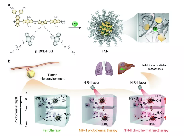 圖1. 單原子納米酶OxgeMCC-r的合成示意圖。2、半導體納米酶用于光熱鐵劑治療[2]鐵劑治療在癌癥治療方面具有廣闊的應用前景,其原理是金屬離子2價鐵離子介導的芬頓反應將癌細胞微環(huán)境中的過氧化氫轉化為毒性的羥基自由基,從而實現(xiàn)對癌細胞的損傷。但芬頓反應在腫瘤微環(huán)境中催化效率低,一定程度上限制了材料的進一步應用。為解決以上難題,南洋理工大學浦侃裔研究團隊合成了基于有機半導體聚合物(pTBCB-PEG)和Fe2+絡合的半導體納米酶(HSN)用于光熱鐵劑療。納米復合酶的設計增強了其在近紅外二區(qū)的成像效果,在近紅外光的照射下,HSM通過光熱效應引起癌細胞死亡,一方面增強芬頓反應,促進過氧化氫的分解和毒性羥基自由基的形成,另外一方面分解產生的自由基將42 nm的納米粒子分解為1.7 nm的微小粒子,增加了其瘤內滲透率,在協(xié)同作用下極大提升了納米酶的抗腫瘤能力和抑制腫瘤轉移能力,在體內小鼠實驗得到。該項研究不僅將無創(chuàng)的光熱治療的組織深度提高到一個新水平(9 mm),而且也揭示了光熱鐵劑治療的機制。最重要的是納米酶的適用范圍可以推廣到其他深度組織病變,比如神經退行性疾病,為新型納米酶提供了更加廣泛的生物醫(yī)用前景。