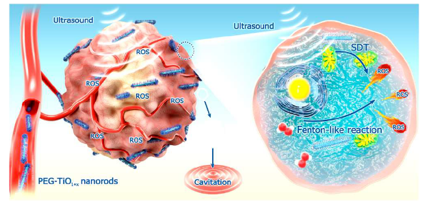 圖2. 半導體納米酶(HSN)合成示意圖與HSN介導的光熱治療和鐵劑治療的對比。3、超細納米酶用于增強的聲動力治療[3]聲動力治療是指利用超聲波極強的組織穿透性來實現(xiàn)無創(chuàng)的新型治療方法。聲敏劑在達到靶點時在超聲波的作用下產生活性氧,從而實現(xiàn)精準、可控的治療效果。二氧化鈦是一種廣泛研究的聲敏劑,具有較高的穩(wěn)定性和較低的毒性。但純的二氧化鈦納米粒子的活性氧量子產率較低,削弱了其治療效果。基于此蘇州大學程亮研究團隊通過種子介導的生長機制設計了一種具有優(yōu)異聲敏性能和辣根過氧化物活性的一氧化鈦納米棒(PEG-TiO1+x NRs),其缺氧結構導致更強的活性氧產生能力,更有趣的是PEG-TiO1+x NRs具有納米酶的性質,高效地催化內源性過氧化氫產生羥基自由基,誘發(fā)癌細胞凋亡和壞死,腫瘤在聲動力和化學動力協(xié)同治療下被有效抑制,其抑制效果明顯優(yōu)于二氧化鈦納米聲敏劑,同時PEG-TiO1+x NRs納米酶沒有明顯的毒副作用,為設計新型的聲敏劑提供了新思路,在腫瘤治療領域具有廣闊的應用前景。