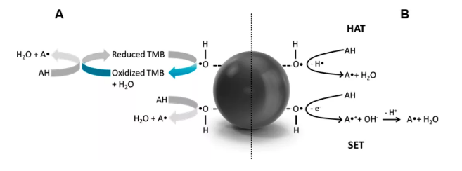 圖4. 利用酶催化原子轉移自由基聚合制備MPGs凝膠和用于熒光成像示意圖。5、鉑納米酶用于測定唾液中總抗氧化劑水平[5]氧化還原失衡和氧化應激相關的生物標記物在人類疾病扮演著重要的作用,總體抗氧化能力(TAC)是一項重要的生理參數(shù),然而抗氧化測試需要復雜的儀器裝置與步驟,并且它們的準確性和敏感性存在有待優(yōu)化的地方。近期意大利技術研究所Pier Paolo Pompa研究團隊將鉑納米酶和羥基自由基探針相結合,利用在納米酶表面的羥基自由基與TMB顯色底物、抗氧劑AH之間的競爭反應,通過單電子轉移(SET)和氫原子轉移(HAT)反應幾乎可以對所有的生理抗氧化物種進行檢測。納米酶與唾液混合5分鐘之后通過比色反應進行測試,實現(xiàn)肉眼或手機快速、準確的檢測觀察。此方法為檢測抗氧化能力開創(chuàng)了新方法,具有高效、便捷、范圍廣和準確等優(yōu)勢,具有極大的實際應用前景。