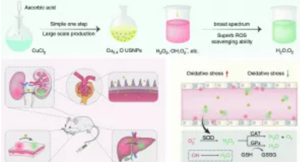 圖5. 鉑納米酶用于檢測抗氧化能力的原理示意圖。6、超小銅基納米酶用于活性氧清除[6]氧化應激反應與許多急性和慢性炎癥疾病有關,但目前臨床上治療方法有限。具有良好活性氧清除能力和生物相容性的酶模擬納米材料的開發(fā)是治療活性氧相關炎癥的一條有效途徑。浙江大學毛崢偉研究團隊報道了一種簡單且有效的一步法開發(fā)超小Cu5.4O納米顆粒,它同時具有多重模擬酶活性和廣譜清除ROS的能力,可用于治療ROS相關疾病。Cu5.4O納米酶同時具有過氧化氫酶、超氧化物歧化酶和類谷胱甘肽過氧化物酶的特性,在極低劑量下對ROS介導的損傷表現(xiàn)出細胞保護作用,顯著改善急性腎損傷、急性肝損傷和傷口愈合的治療效果。同時,Cu5.4O納米酶超小尺寸使其在腎臟內快速清除,保證了生物相容性。Cu5.4O納米酶的保護作用和良好的生物相容性將促進ROS相關疾病的臨床治療和下一代納米酶的開發(fā)。