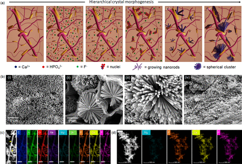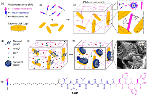 該團(tuán)隊開發(fā)了一種共組裝有機(jī)-無機(jī)水凝膠平臺,用于體外晶體生長,由 3D 超分子限制框架內(nèi)的顆粒附著機(jī)制介導(dǎo)。設(shè)計策略取決于 Lap 納米盤和陽離子 PAH3 分子之間的靜電相互作用,以將有機(jī)和無機(jī)組分的固有特性整合到獨(dú)特的有機(jī)-無機(jī)水凝膠結(jié)構(gòu)中。所得材料顯示出高表面積、高機(jī)械性能和自修復(fù)性能。此外,共組裝的 PA-Lap 水凝膠顯示出一種納米級結(jié)構(gòu),可作為羥基磷灰石從有序納米棒分級生長到明確定義的球形簇的密閉空間。該研究探索了這種礦化機(jī)制,作為一種仿生 3D 模型來調(diào)節(jié)氟化羥基磷灰石的成核和時空組織。