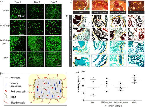 利用光譜和散射技術(shù)以及分子動力學(xué)模擬方法來確認(rèn)PAH3納米纖維靜電吸附并符合 Lap 納米盤的表面。電子和原子力顯微鏡也證實了與 Lap 共組裝后 PAH3 納米纖維的直徑和表面積增加。動態(tài)振蕩流變學(xué)表明,共組裝的 PAH3-Lap 水凝膠顯示出高剛度和強(qiáng)大的自愈行為,而氣體吸附分析證實了分層和異質(zhì)孔隙度。此外,三維 (3D) 矩陣中的這種獨(dú)特結(jié)構(gòu)為高縱橫比羥基磷灰石納米棒在3D矩陣內(nèi)成核和分層組織成明確定義的球形簇提供了空間限制。有機(jī)-無機(jī)PAH3-Lap水凝膠的適用性在體外使用人骨髓基質(zhì)細(xì)胞(hBMSCs)和體外使用雞絨毛尿囊膜(CAM)測定進(jìn)行評估。結(jié)果表明,有機(jī)-無機(jī)PAH3-Lap水凝膠促進(jìn)人體骨骼細(xì)胞增殖,并在礦化后與 CAM 結(jié)合,被血管浸潤,刺激細(xì)胞外基質(zhì)產(chǎn)生,并促進(jìn)相對于對照的廣泛礦物質(zhì)沉積。相關(guān)論文以題為De Novo Design of Functional Coassembling Organic–Inorganic Hydrogels for Hierarchical Mineralization and Neovascularization發(fā)表在《ACS Nano》上。