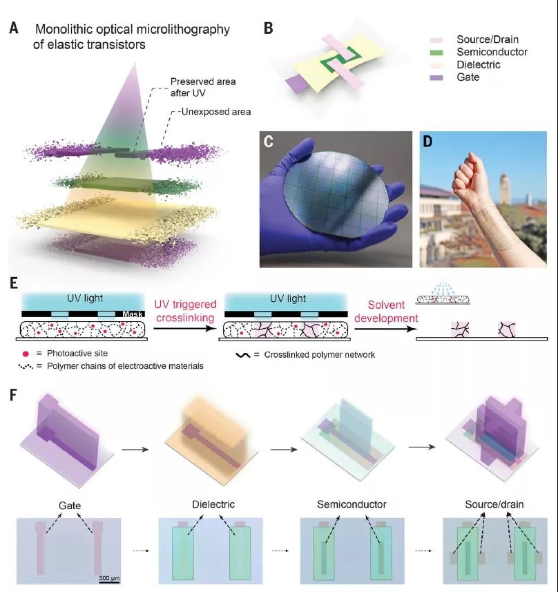 近日,斯坦福大學鮑哲南團隊提出了一種單片光學微光刻工藝,該工藝通過連續紫外光觸發溶解度調制,直接對彈性電子材料進行圖案化。研究人員制作了溝道長度為2微米的晶體管,密度高達42000個晶體管/每平方厘米;谠摲椒ㄟ構建了包含異或門和半加法器的彈性電路(兩者都是算術邏輯單元的基本組件)。該工藝為實現復雜、高密度、多層彈性電路的晶圓級制造提供了思路,且性能可與剛性電路相媲美。該研究以“Monolithic optical microlithography of high-density elastic circuits”為題發表在最新一期的《Science》上。據了解這是鮑哲南院士2020到現在的第三篇Science。連發2篇《Science》,柔性電子女神,鮑哲南院士2020年成果集錦)