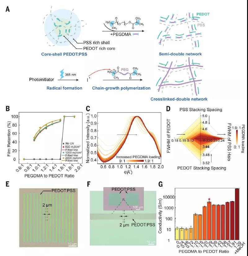 PEDOT:PSS的溶解度可以通過將物理交聯導電網絡嵌入共價交聯PEGDMA網絡來實現。PEDOT與PEG連接劑之間的強相互作用導致PEDOT:PSS的微觀結構從核殼結構轉變為更長的鏈,從而形成了第一個導電網絡(圖2A)。在紫外光(365 nm)引發后,丙烯酸二甲酯(DMA)修飾的聚乙二醇經過快速自由基聚合形成第二個網絡。兩個網絡之間強烈的分子間相互作用使暴露于紫外線的區域能夠抵抗水,而未暴露的區域仍然是水溶性的。這種光圖案化能力與PEGDMA/PEDOT的配比極為相關,PEGDMA不足會導致薄膜耐腐蝕性差,而過多則會導致紫外線曝光前就形成交聯(圖2A,B)。隨著PEG連接劑的增加,PEDOT分子間的鏈間偶聯更強,PEDOT π-π堆積距離逐漸減小,形成更大的晶粒(圖2C,D)。通過調整合適的配比(1.15:1 PEGDMA/PEDOT),實現了分辨率2 μm的圖案化(圖2E,F)。此外,PEGDMA的加入也大大提高了PEDOT:PSS的電導率。