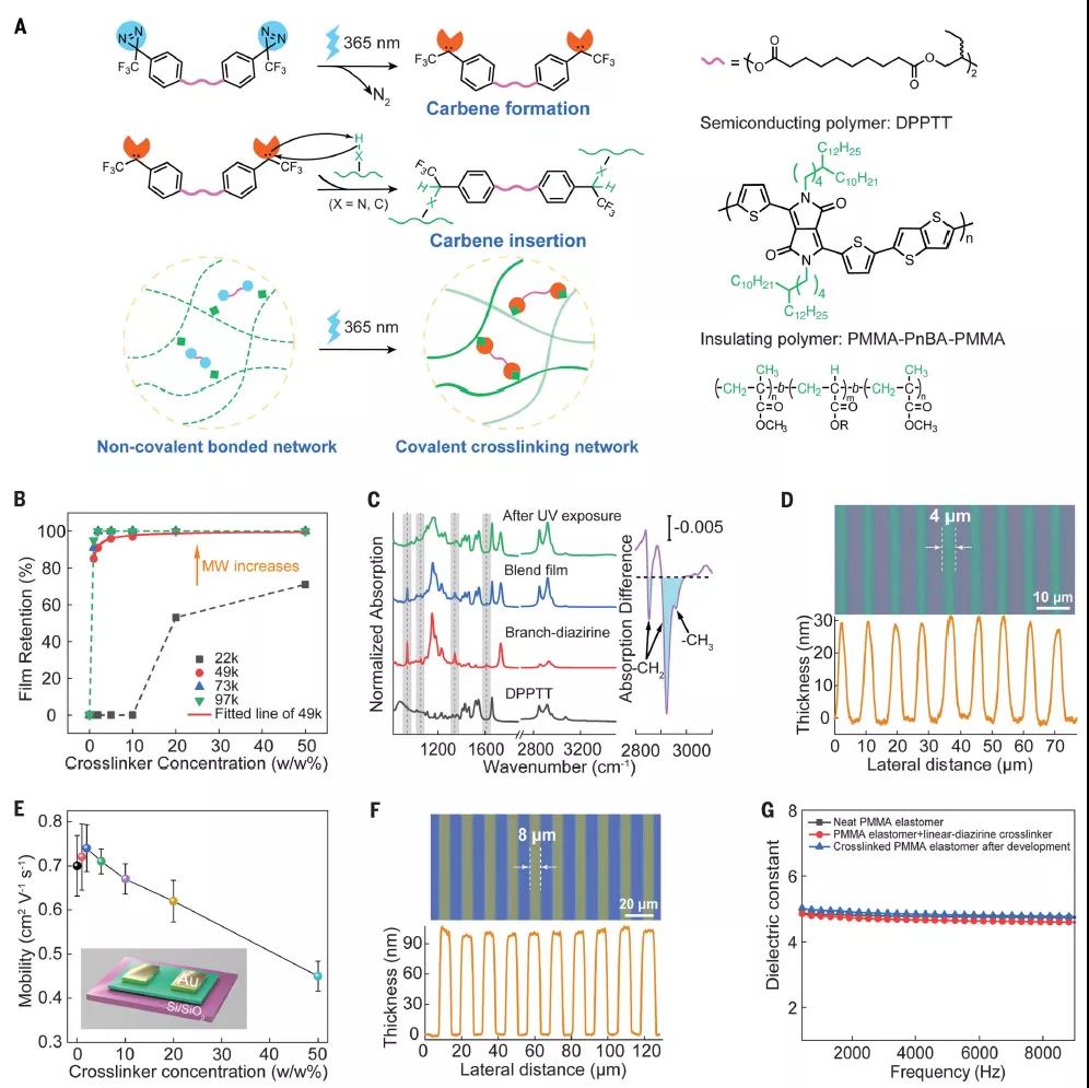 引入了雙端功能化三氟甲基取代的二氮雜吡啶(trifluoromethyl-substituted diazirine)交聯劑 (圖3A)。通過快速光解形成的卡賓物種可以發生特異性于共軛聚合物側鏈上非共軛鍵的清潔反應,導致分子量增加,從而產生紫外誘導的溶解度調節。這種交聯反應針對非共軛側鏈而不破壞主鏈上的共軛。防止了半導體聚合物電荷傳輸特性的降解。光交聯效率隨聚合物分子量的不同而不同(圖3B)。降低分子量分布可以進一步提高分辨率。此外,交聯劑含量越高,薄膜遷移率越低(圖3E)