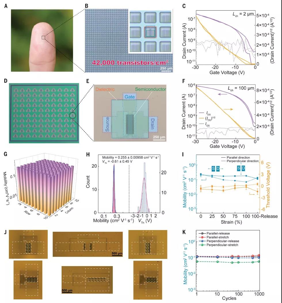 研究人員在0.238 cm2的基底上制作了一個包含10,000個晶體管的全聚合物彈性晶體管陣列(圖4A,B),器件密度高達42000個晶體管/每平方厘米,是前期采用掩膜蝕刻工藝制備陣列密度的100倍以上。器件溝道長度2μm,寬40μm。開關比為104,且off態電流低至0.5 nA(圖4C)。隨后制備了10×10的晶體管陣列,每個單元器件都表現出典型的P型轉移曲線,平均飽和遷移率為0.255 m2 V–1 s–1(圖4F)。器件產率為98.5%,標準偏差僅為3.76%(圖4G)。閾值電壓(Vth)的分布為0.61±0.45 V(圖4H),僅為工作柵源電壓窗口(30 V)的1.5%。在平行和垂直于電荷傳輸方向的100%應變下,晶體管陣列沒有任何可見的裂縫或分層(圖4J),證實每層的力學性能優異。其電學性能在沿電荷輸運方向、100%應變下也能夠保持穩定,遷移率保持在原始值的88%,閾值電壓接近0v(圖4I)。在垂直方向拉伸下,遷移率略有下降。在兩個方向50%應變下,可以承受1000次的重復拉伸,電學性能無明顯變化(圖4K)。