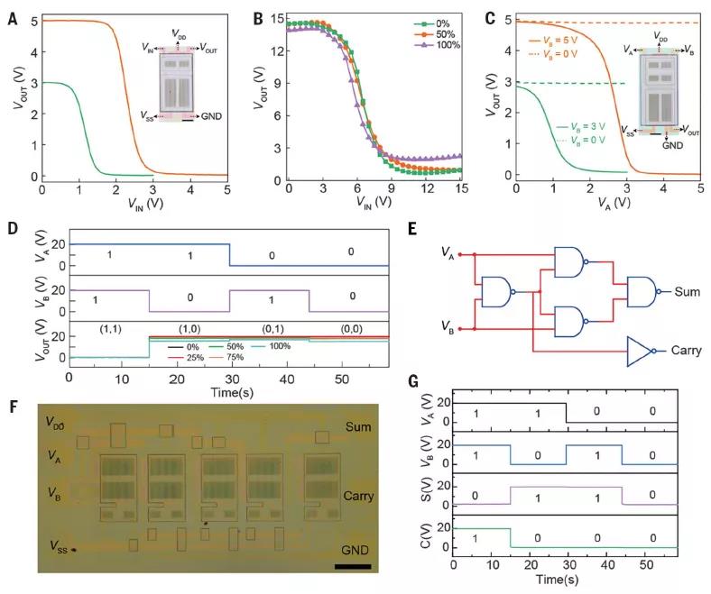 最后,研究人員制備了逆變器和與非門。彈性逆變器的溝道長度僅為10μm,比前文報導的空間分辨率高出一個數量級。在邏輯輸入狀態為0和1的情況下,100%應變下的逆變器也能夠正常工作(圖5B)。更復雜的邏輯電路異或門(24個晶體管集成)和半加法器(30個晶體管集成)的正常工作表明所有單元器件的均勻性和高成品率。