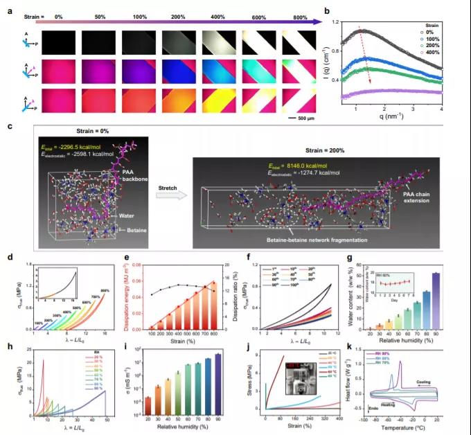 與依賴大量溶劑使用的水凝膠和離子凝膠不同,目前的離子彈性體只存在平衡含水量。這一特性使得分子間二聚體氫鍵足夠強,可以在常溫下交聯多羧酸鏈,同時當浸泡在高濕度中時會變得動態,從而實現完全的自愈合,此外,由弱配合兩性離子組成的兩性網絡有助于離子彈性體的初始柔性,隨后在拉伸過程中會碎裂,從而形成一個非常堅硬的氫鍵合的聚羧酸網絡。