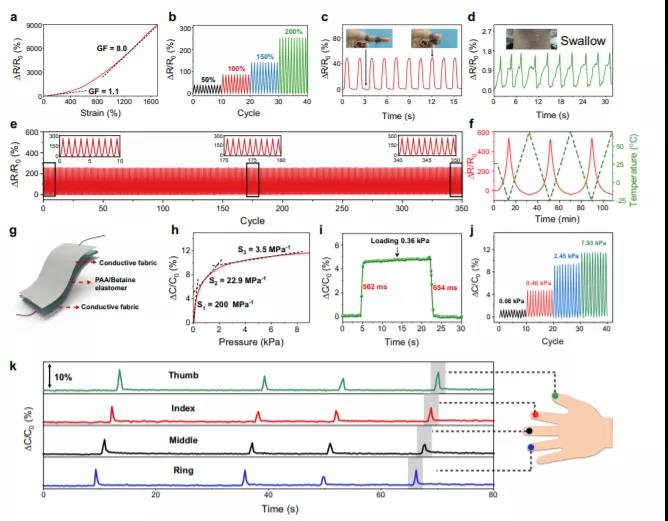 作為皮膚類傳感器,離子彈性體對應變和溫度變化表現出及時的響應,并可進一步與彈性導電織物集成,作為離子智能傳感器感知壓力變化,顯示出其在可穿戴電子產品中的巨大應用潛力。