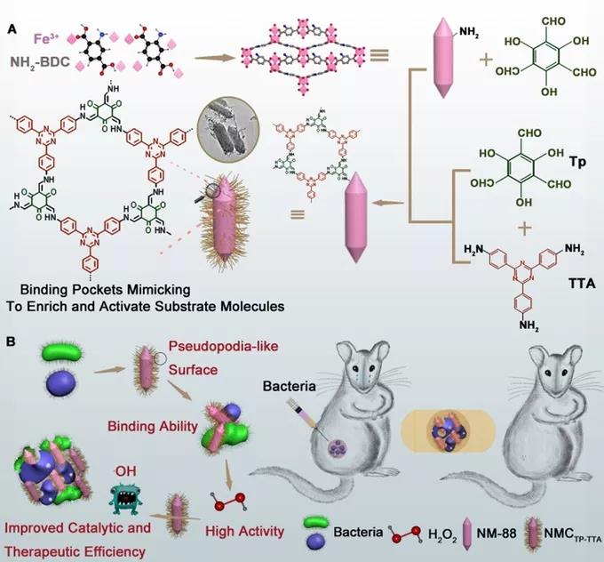 大量研究報(bào)道金屬有機(jī)框架(MOF)結(jié)構(gòu)具有模擬酶的功能,但由于其類酶催化活性較低,因而使得其在催化性能和治療效果方面不能令人滿意。基于此,中科院長(zhǎng)春應(yīng)化所曲曉剛研究員和任勁松研究員等人2021年在Angewandte Chemie International Edition 上發(fā)表了“Nature-Inspired Construction of MOF@COF Nanozyme with Active Sites in Tailored Microenvironment and Pseudopodia-like Surface for Enhanced Bacterial Inhibition”一文,該研究利用源于自然的靈感設(shè)計(jì)并構(gòu)建了具有定制微環(huán)境活性位點(diǎn)和偽足類表面的MOF@COF納米酶(NMCTP-TTA),從而增強(qiáng)納米酶的催化和治療效率。研究中采用“順序生長(zhǎng)”的方法來(lái)合成NMCTP-TTA。首先溶劑熱法制備NM-88并通過(guò)席夫堿反應(yīng)形成NM-88-CHO,接著COF共價(jià)連接Tp 和 TTA 構(gòu)建NM-88-CHO,最后將連接到NM-88-CHO上形成NMCTP-TTA。所得到的納米粒子在活性位點(diǎn)周圍形成特定的微孔環(huán)境,通過(guò)非共價(jià)相互作用富集和激活底物分子,這種樹杈狀結(jié)構(gòu)納米酶可以如同中性粒細(xì)胞“偽足”樣捕獲細(xì)菌并產(chǎn)生ROS有效地殺死細(xì)菌。