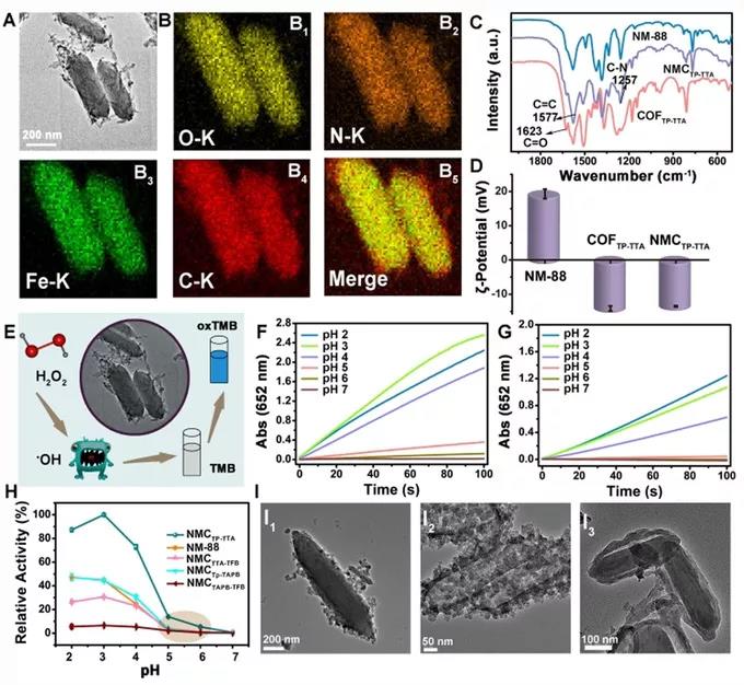 圖1,A)NMCTp-TTA的TEM圖像;B)EDS圖像;C,D)COFTp-TTA,NM-88和NMCTp-TTA的FT-IR和ζ電位;E)NMCTp-TTA的過(guò)氧化物酶樣活性示意圖;F,G)通過(guò)監(jiān)測(cè)pH 2–7在652 nm處TMB的吸收,NMCTp-TTA和NM-88的過(guò)氧化物酶樣活性。H)對(duì)它們的過(guò)氧化物酶樣活性的定性分析;I)NMCTTA-TFB,NMCTp-TAPB,NMCTAPB-TFB的TEM圖像。