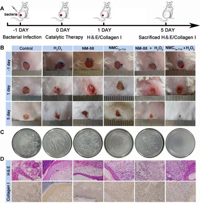 圖3 ,A)對(duì)金黃色葡萄球菌傷口感染模型的治療策略示意圖;B)在第1天和第5天用不同處理方法處理的傷口感染模型的圖像;(C)用不同處理方法從傷口組織中分離出的細(xì)菌菌落的圖像;D)處理5天后,從小鼠獲得的皮膚組織的H&E和膠原蛋白I免疫組織化學(xué)染色(比例尺為50μm)。