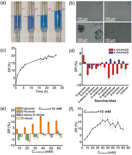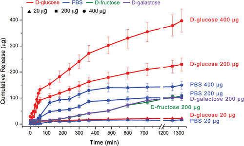 雙齒 β-CD 通過三個簡單的反應很容易合成,從 DMβCD 和對(溴甲基)苯基硼酸開始。雙齒β-CD的形成過程被發現是尺寸選擇性的,因為從間(溴甲基)苯基硼酸試劑中,不能提供雙齒β-CD衍生物。雙齒 β-CD(即 4-CH2PACD)包含葡萄糖狹縫,并顯示出與 D-葡萄糖的高效特異性結合。合成的 4-CH2PACD 被摻雜到 PAAm 水凝膠中,賦予水凝膠對 D-葡萄糖的特異性反應。具體而言,當凝膠在 D-葡萄糖溶液中平衡時,水凝膠的膨脹是可見的,而在 D-葡萄糖異構體(如 D-果糖和 D-半乳糖)溶液中則收縮。發現這種特征有利于自我調節的特定葡萄糖響應性胰島素釋放,因為溶液中高濃度的 D-葡萄糖會導致凝膠膨脹并增加網格尺寸。體內試驗表明,在 T1DM 中預加載雙齒 β-CD 和短活性胰島素的 PAAm 水凝膠能夠實現長期持續的血糖控制。預計這種簡便的合成方法將為雙齒 β-CD 作為各種重要生物化合物或代謝物的受體的合成打開一扇新的大門。考慮到 β-CD 與許多生物或藥物活性化合物之間的多功能主客體內含物,以及雙齒 β-CD 與靶向生物分子之間的特定相互作用,為 DSGTIR 開發了一種新機制。