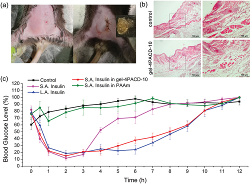 最近,鄭州大學基礎醫學院梅英武副教授,陜西科技大學Renqi Wang博士、陳詠梅教授團隊共同提出了一種仿生葡萄糖觸發-胰島素釋放系統,即一種預載胰島素的雙齒 β-環糊精基水凝膠;雙自我調節系統顯示特定的 D-葡萄糖反應,以實現準確監測和同時按需觸發胰島素釋放。D-葡萄糖與雙齒β-環糊精之間的特異性結合誘導質子的釋放,導致水凝膠的宏觀膨脹,隨后觸發胰島素的按需和長期補充。相反,D-葡萄糖的異構體,如 D-果糖和 D-半乳糖,會導致水凝膠收縮,并延遲胰島素釋放。I 型糖尿病小鼠模型的體內研究確定,雖然雙齒 β-CD 水凝膠預裝了短效胰島素,但它可以在12小時內對血糖水平進行長效控制。相關論文以題為Biomimetic Glucose Trigger-Insulin Release System Based on Hydrogel Loading Bidentate β-Cyclodextrin發表在《Advanced Functional Materials》上。