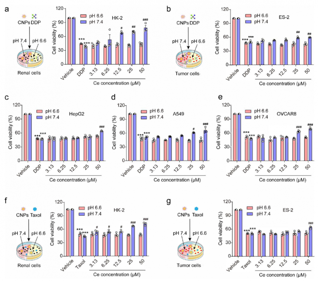 順鉑(DDP)是廣泛使用的抗實體腫瘤藥物,具有腎毒性,究其原因是腎上皮細胞是DDP誘導腎毒性的主要目標。使用HK-2細胞和ES-2細胞來研究CNPs對腎臟的pH依賴的保護作用,實驗表明:在pH7.4時CNP明顯降低了DDP誘導的細胞毒性,在pH=6.6或pH=6.0時卻不受影響;而小分子抗毒劑NAC在pH=6.6時仍具有抗毒性。在其它腫瘤細胞和正常細胞中,如腫瘤細胞OVCAR8,HepG2,A549和正常的LO2細胞,CNPs均表現出pH依賴的抗DDP毒的細胞保護效應。此外CNPs在HK-2細胞和ES-2細胞中也具有pH依賴的抗紫杉醇細胞毒性的作用。
