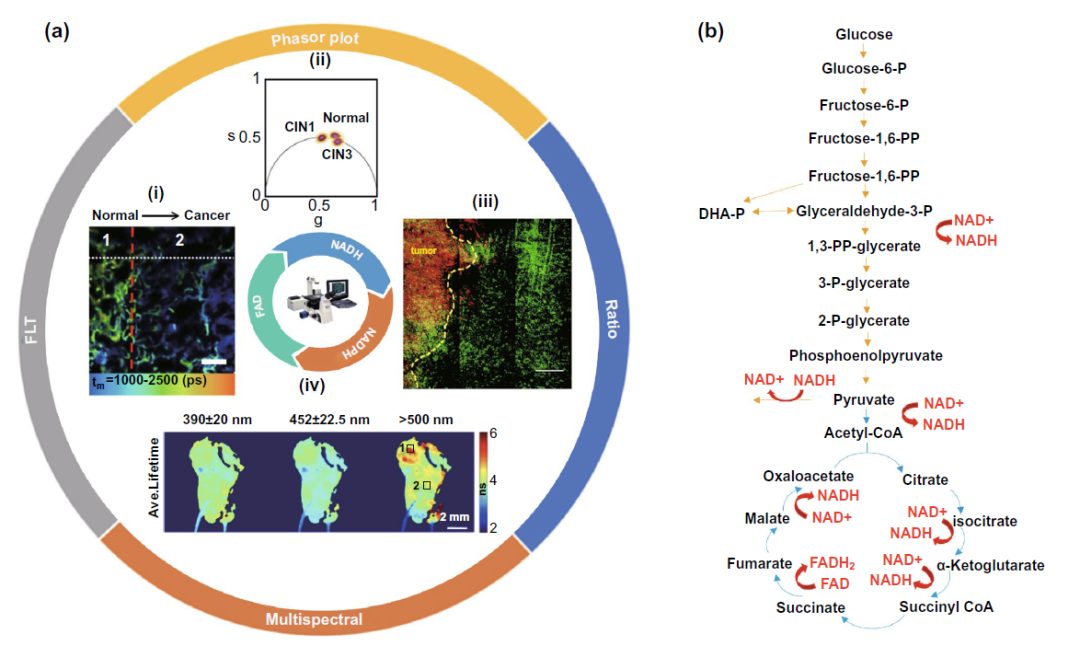 圖3. FLIM結合NADH、FAD自發熒光的研究縱覽和核心糖代謝通路中NADH、FAD分子的變化情況。(a-i) 基于熒光時間差異FLIM輔助肺癌手術切除。(a-ii) FLIM相量圖輔助宮頸癌癌前病變分型。(a-iii) NADH/NAD+比值輔助腫瘤邊緣病灶確定。(a-iv) 多光譜FLIM輔助口腔癌前病變定位及分型。(b) 糖酵解和三羧酸循環中NADH、FAD分子變化情況。