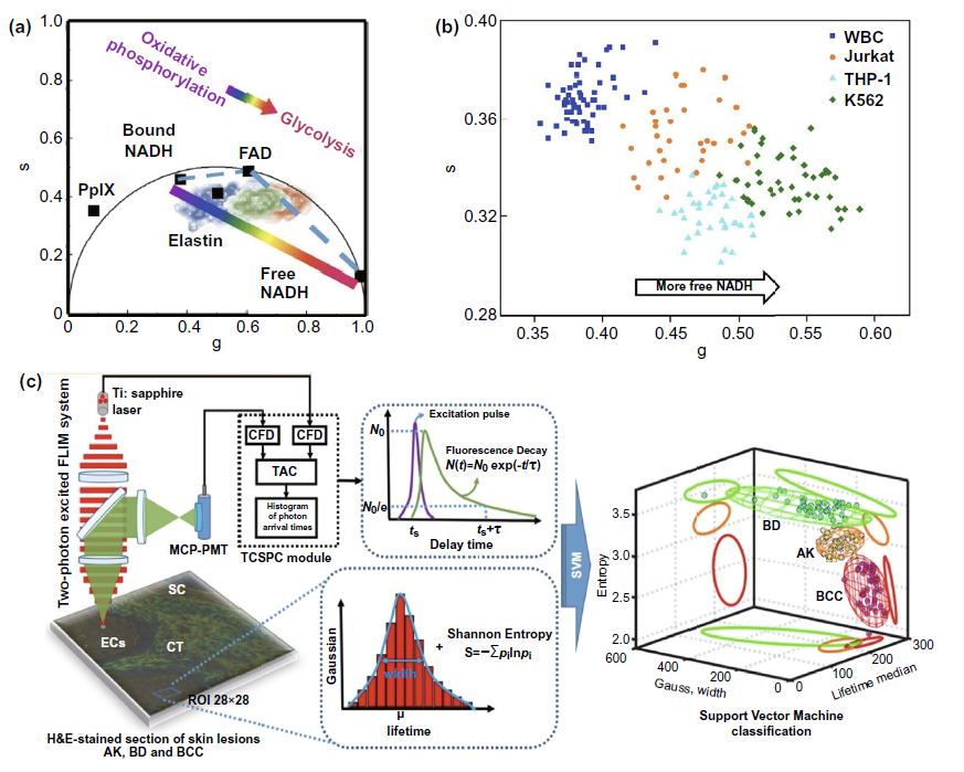 圖4. FLIM相量圖以及多參數FLIM分類系統用于癌癥領域的相關研究。(a) FLIM相量圖的繪制原理,通過對相量圖中自發熒光分子相量點位置等信息的分析可以獲得不同檢測樣本中細胞氧化磷酸化、糖酵解等代謝變化信息。(b) 利用FLIM相量圖中不同樣本中得到的熒光分子集群式分布差異,反應不同檢測樣本中細胞代謝差異,基于此對白血病細胞亞型進行分類和診斷。(c) 利用support vector system輔助基底細胞癌(BCC),光化性角化病(AK)和鮑溫病(BD)的診斷分型。