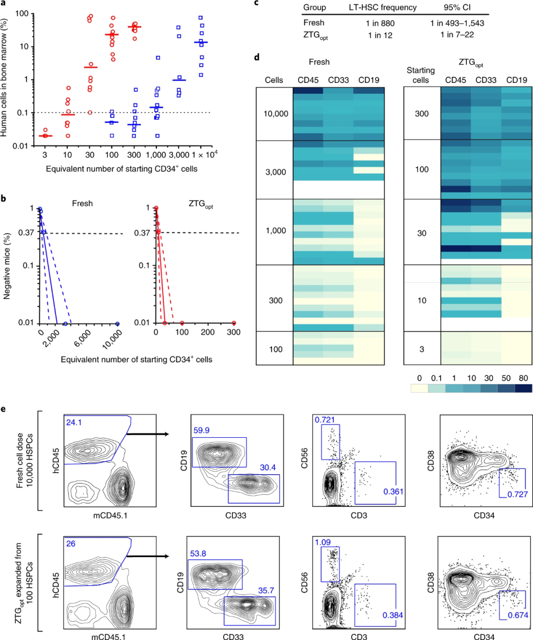ZTG opt方式培養(yǎng)的臍帶血來源的CD34 + HSPC在體內可保持擴增能力已得到證明,研究人員又利用有限稀釋分析(LDA)來檢測中長期再生造血干細胞(LT-HSC)的擴增頻率的情況。實驗結果如圖3所示,在移植后24–30周后,ZTG opt方式培養(yǎng)的LT-HSC的擴增頻率遠高于其他培養(yǎng)方式。有限稀釋分析和二次移植實驗均證明ZTG培養(yǎng)擴增了具有長期造血功能的LT-HSC細胞。