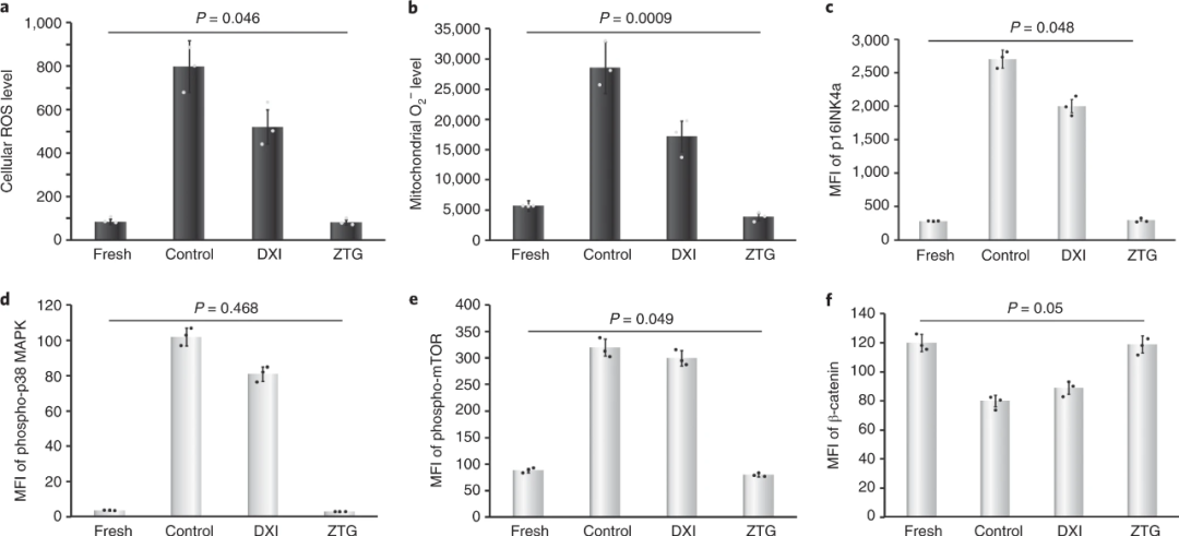 在正常生理狀態(tài)下,原始的HSPC駐留在低氧的生態(tài)位中,可限制細胞產生ROS進行自我保護。為了探討了 ZTG 水凝膠3D培養(yǎng)是否可以限制ROS的產生并保護封裝的HSPC,研究人員檢測了各系統(tǒng)中培養(yǎng)1天后的細胞反應,如圖4所示,對比DXI組和對照組,ZTG組的細胞ROS和線粒體超氧化物水平偏低且非特異性信號通路無明顯激活,有利于HSPC增強自我更新。