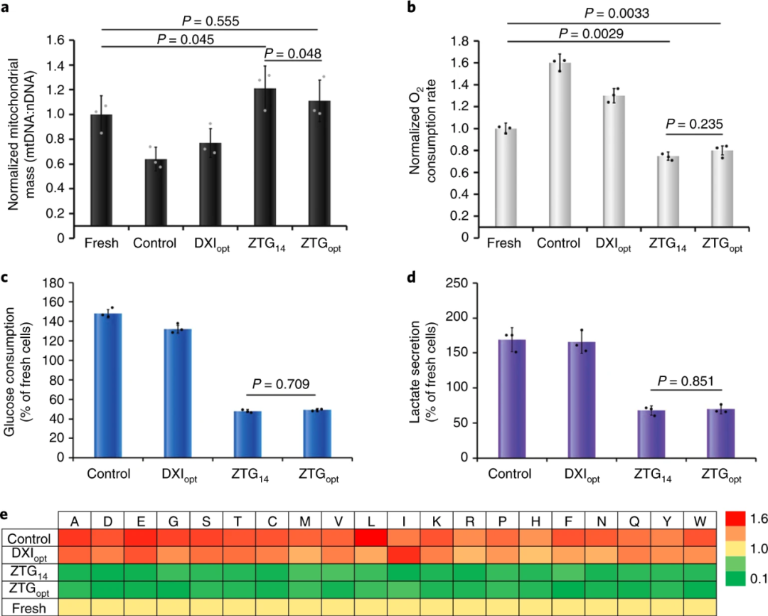 此外,研究人員通過分析ZTG14,ZTGopt和其他擴增方式培養(yǎng)的細胞內線粒體質量和代謝活性,發(fā)現(xiàn)ZTG14和ZTGopt細胞中線粒體質量略有增加,與DXIopt和對照組的顯著下降形成鮮明對比,另外葡萄糖消耗和乳酸分泌量也遠低于DXIopt和對照組。實驗結果如圖5所示,表明ZTG培養(yǎng)中O2相關的代謝受抑制,再次證明 ZTG水凝膠3D培養(yǎng)方式保持了原始的HSPC特性。