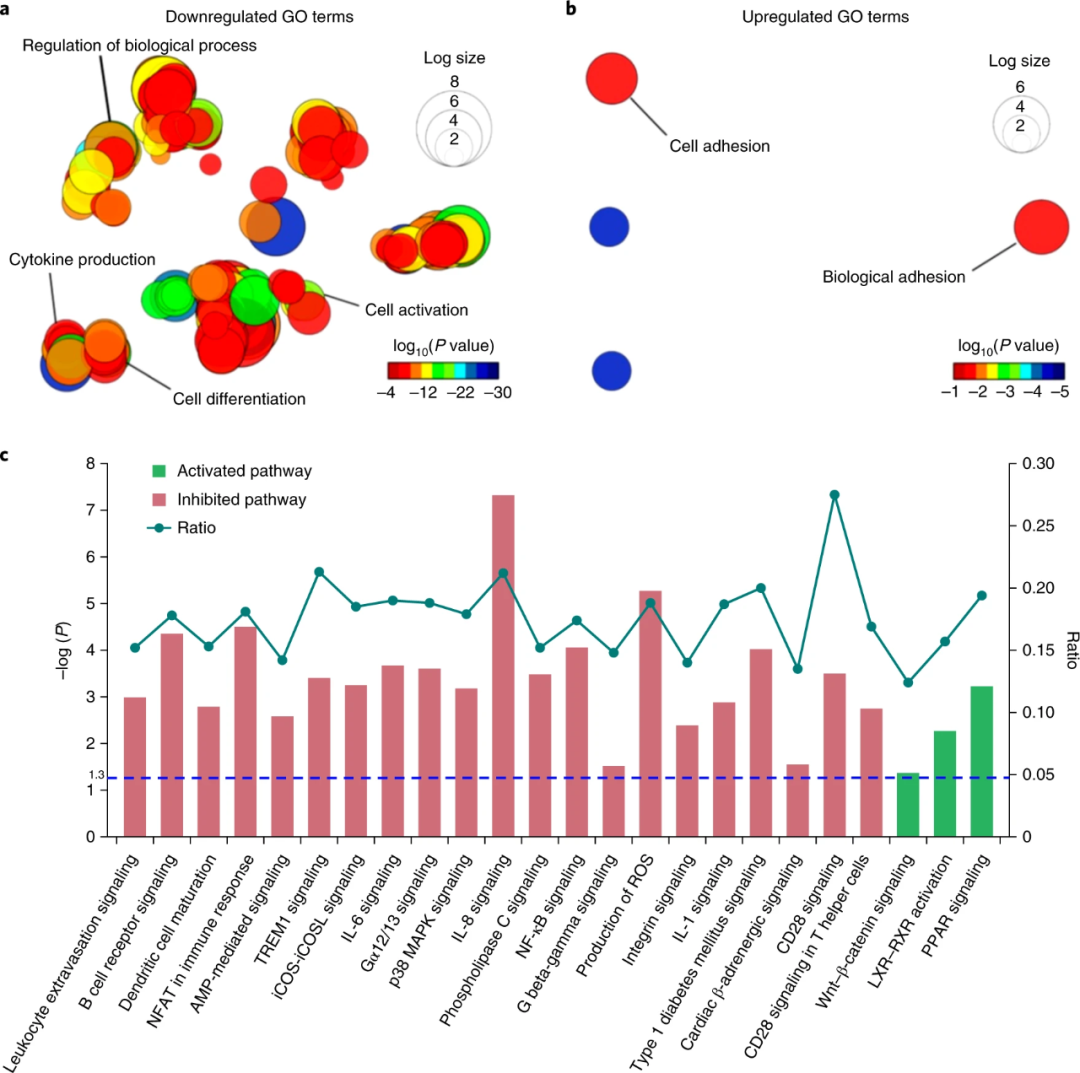 為了更深入地了解ZTG水凝膠內的CD34 + HSPC的活性,研究人員利用mRNA深度測序(RNA-seq)進行了基因表達譜分析。如圖6所示,與新鮮分離的原代HSPC相比,超過10,000個基因的表達在ZTG培養(yǎng)的HSPC中沒有顯著變化。對比其他培養(yǎng)方式,ZTG培養(yǎng)組中與細胞分化,細胞活化和細胞因子產生相關的基因顯著下調,再次表明ZTG培養(yǎng)方式可減緩細胞代謝過程。
