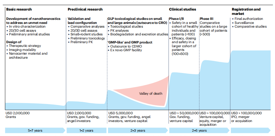 本文首先討論“構(gòu)建”納米治療的許多方法中的一些,重點(diǎn)是不同的成像方式和治療策略。然后概述了目前使用的納米治療在人類臨床發(fā)展的不同階段,鑒定具體的優(yōu)勢(shì)和機(jī)會(huì)。最后,我們定義關(guān)鍵步驟沿著臨床前和臨床發(fā)展的曲折道路提出解決技術(shù)、生產(chǎn)、法規(guī)問題的建議以及安全有效的納米治療臨床轉(zhuǎn)化的經(jīng)濟(jì)挑戰(zhàn)。