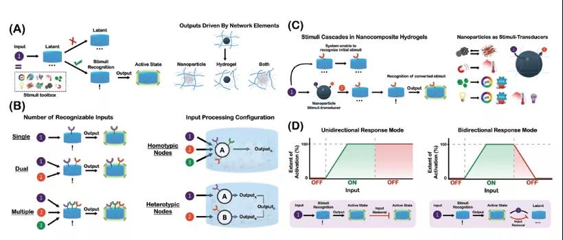 Figure 1. The dynamic response process of the stimulus-responsive nanocomposite hydrogel to internal and external stimulus input. [Content interpretation] 1. Nanocomposite hydrogel design and assembly method Nanocomposite hydrogel refers to a hydrated polymer network containing nanomaterials, which can be assembled through non-covalent interaction or covalent connection. In the independent system, only one of the modules needs to interact with each other, and the other component is used as a network filling component to form a stronger system through self-crosslinking; while the assembly of the co-dependent system requires the interaction between hydrogel and NP, The resulting composite gel may be the addition or synergy of the two components. The assembly method of the composite system is usually divided into four types: (1) the hydrogel precursor is added to the pre-assembled NP suspension for cross-linking, so that the particles are pre-distributed in the scaffold; (2) the original hydrogel is cross-linked Positions form NP; (3) After the hydrogel is cross-linked, the pre-assembled nanoparticles diffuse inward; (4) The co-dependent hydrogel is assembled by using nanoparticles as a matrix/network cross-linking agent. 2. Stimulus response nanocomposite hydrogel design. The combination of NP and hydrogel can form a system with excellent performance, and the performance can be further expanded through stimulus response. Generally, the composite hydrogel can be decomposed into core components such as NP or hydrogel matrix, as the stimulus response or effect module in the material, and cause system changes in the form of output after recognition. In addition to responding to a single stimulus, biological systems can also be equipped with multiple receptors to respond to different stimulus inputs, and recognize and process different numbers of stimuli based on their composition as the initial input signal. The multi-component and hierarchical structure also facilitates the encoding of multiple stimulus responses by combining the hydrogel matrix and NP. The development of this multiple stimulus response system is essential to improve the sensitivity and compliance of drug transport in the body. In addition, similar to living cells, some NPs can also benefit their own transformation capabilities as intelligent transformation components, which connect multiple stimuli in an orderly manner through transformation nodes, and respond to many previously unrecognizable stimuli through NP stimulation sensors. Most of the current stimulus conversion nodes come from nanomaterials as natural stimulus sensors or NPs that can carry stimulus conversion characteristics. According to the identified stimulus, the response is divided into two modes, one-way and two-way.