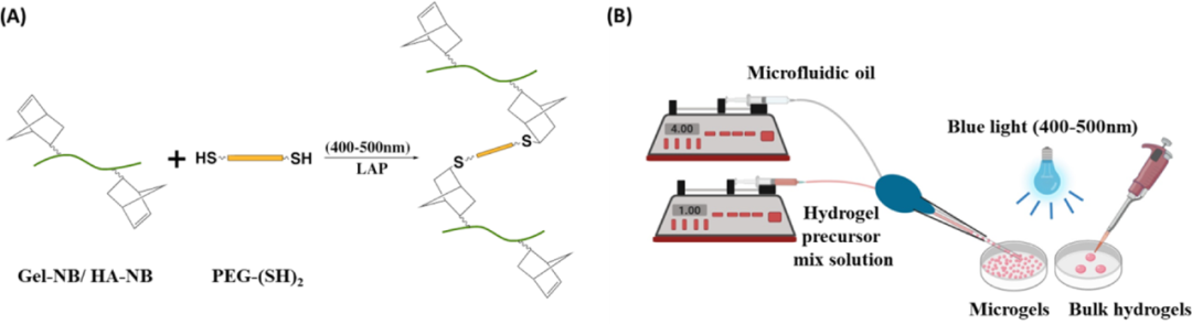 Figure 4 (A) Schematic diagram of the thiol-norbornene click reaction; (B) Schematic diagram of the preparation of bulk hydrogel and microgel