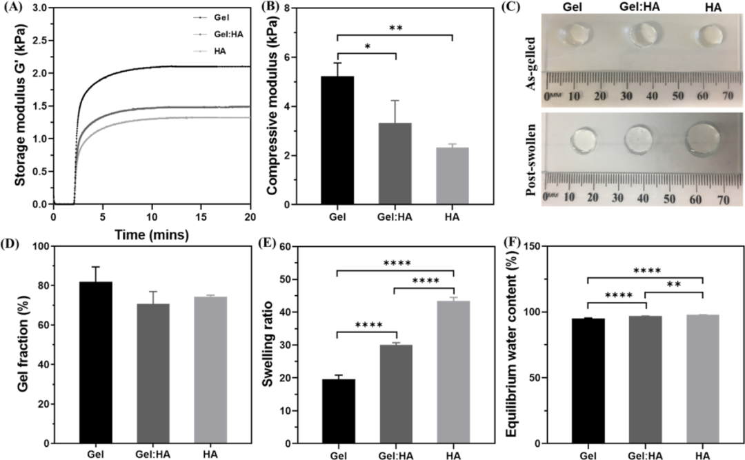 First, the author designed three different hydrogels containing thiol-functionalized PEG (PEG-(SH)2), and combined them with norbornane functionalized gelatin (Gel-NB) or norbornyl functionalized hyaluronic acid (HA -NB) or a mixed gel of Gel-NB and HA-NB. The photocrosslinking kinetics of the hydrogel was monitored by in-situ photorheology, and the results showed that, regardless of the composition of the hydrogel, the gel can quickly form within a few seconds of light exposure. From the stress-strain curve obtained from the compression test, it can be seen that the compressive moduli of Gel, Gel:HA and HA hydrogels are 5.2, 3.3 and 2.3 kPa, respectively, which are the same as the storage modulus. These data indicate that the hardness of the hydrogel shows a trend of Gel>Gel:HA>HA. Since hydrogels with high water content tend to be softer than hydrogels with low water content, the difference in hydrophilicity between HA and gelatin may also lead to differences in the mechanical properties of the hydrogels formed by them (Figure 2).