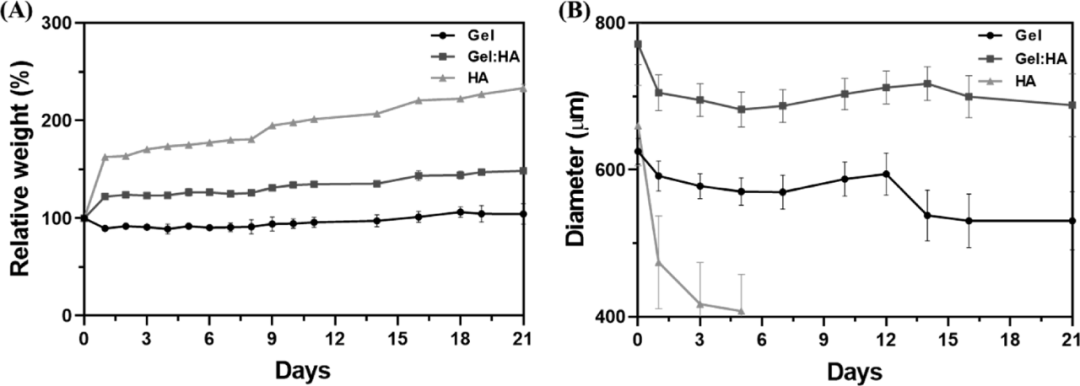 In order to understand the stability and suitability of hydrogels for cell culture, the authors measured the in vitro degradation rates of three hydrogel preparations in large volume and microgel state. Compared with block hydrogels, the quality of Gel:HA and HA hydrogels in DPBS is significantly increased. The gel quality of all volumes of hydrogels remained relatively stable within 10 days. After 10 days, a gradual increase in the quality of all hydrogel components was observed, with a higher proportion of HA increase. At the same time, the degradation performance of the microgel is significantly different from that of the overall hydrogel. The increase in the specific surface area of the microgel and the block hydrogel increases the mass transfer and causes the block hydrogel to degrade faster. This effect is more obvious for the highly hydrophilic HA microgel, which may be due to High degree of swelling (Figure 4).