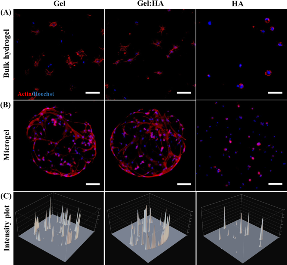 After that, the proliferation and cytoskeleton morphology of hBMSC were further analyzed. The results show that the cells in Gel and Gel:HA hydrogels are well distributed and prominent, indicating good interaction and adhesion with the polymer matrix. In contrast, the cells in the HA hydrogel remained round, possibly due to the lack of binding sites in HA. Regardless of the composition, the distribution of encapsulated cells is uniform for the bulk hydrogel. In contrast, almost all encapsulated cells in Gel and Gel:HA microgels migrate to the periphery of the microgel, but this effect is not obvious. The author speculates that this may be due to the cells actively sensing the higher mass transfer and nutrient concentration on the surface of the microgels, thereby migrating to the surface (Figure 6).